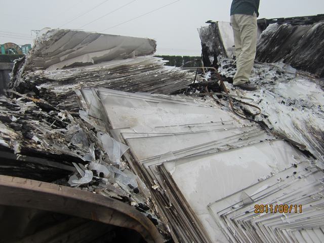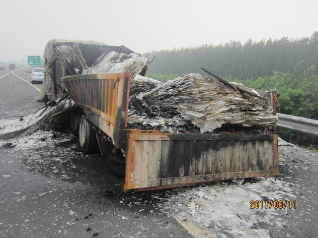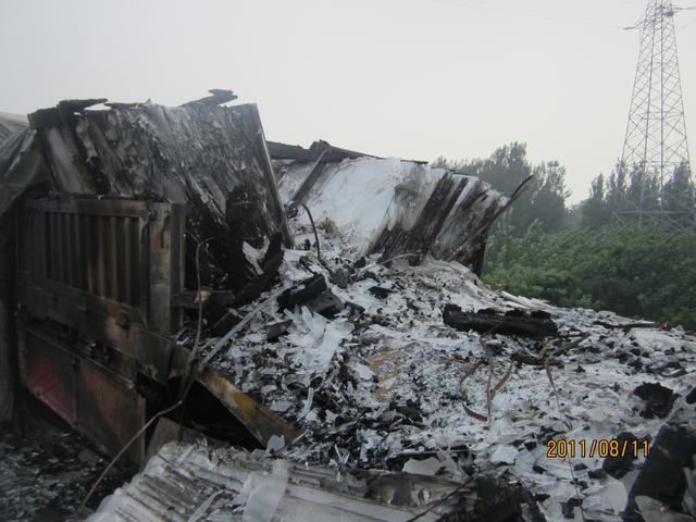 中国物流联合运输协会 物流企业国内公路货物运输保险条款 真实理赔“案例第21起” 被保险单位:山东省烟台市 李俊 被保险人:李俊 出险时间:2011年8月11日; 出险地点:山东金山高速; 出险原因:轮胎突然自燃,导致车上货物80%烧毁; 现场照片