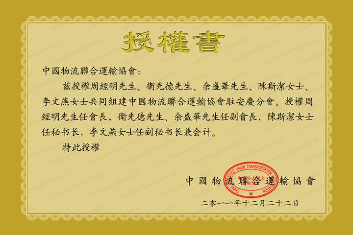 中国物流联合运输协会安庆分会授权书