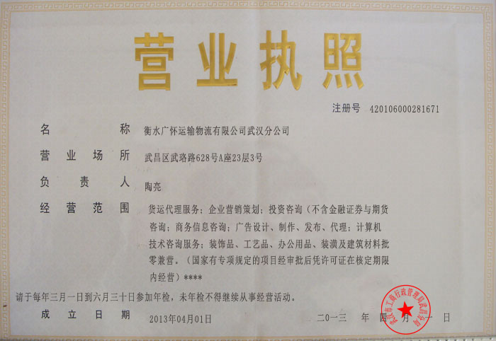 衡水广怀运输物流有限公司武汉分公司营业执照(正本)