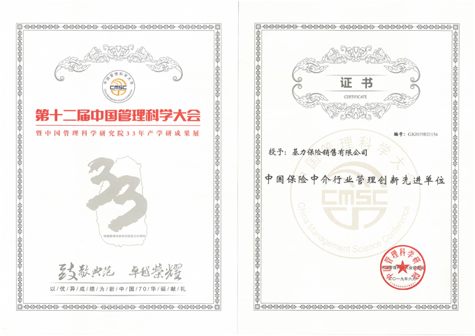 中国保险中介行业管理创新先进单位-证书
