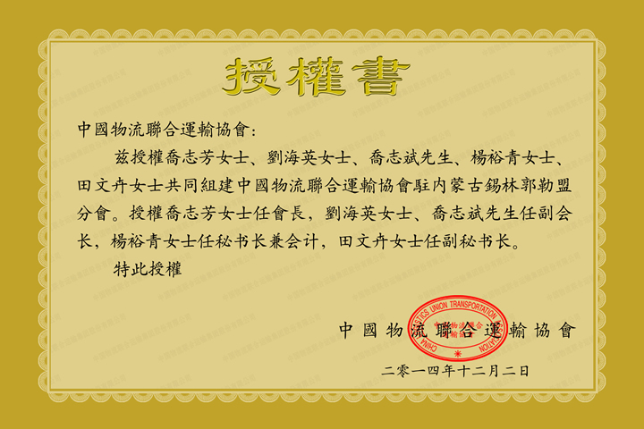 中国物流联合运输协会锡林分会授权书
